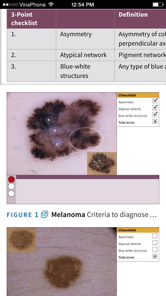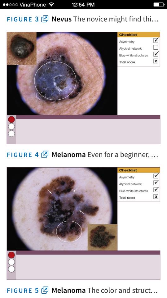 Việc sử dụng dermoscopy giúp bác sĩ thấy được những hình ảnh đặc trưng của tổn thương thay đổi sắc tố và kể cả những tổn thương không thay đổi sắc tố so với việc chỉ thăm khám bằng mắt thường. Các nốt ruồi hay các thay đổi sắc tố khác như tàn nhang, dày sừng ánh sáng, dày sừng da dầu và u máu có thể phân biệt rõ là lành tính hay không nhờ vào dermoscopy. Khi thăm khám bằng mắt thường, nếu có những tổn thương gây nghi ngờ người bác sĩ phải cắt bỏ hoặc sinh thiết để có chẩn đoán chắc chắn, trong khi nếu dùng Dermatoscope họ có thể thấy rõ hình ảnh lành tính của tổn thương nên không cần phải cắt bỏ, sinh thiết, hay tiểu phẩu cho bệnh nhân nữa. Với phương pháp này, hình ảnh đặc trưng của u hắc tố da (melanoma), hay hình ảnh đặc trưng của ung thư tế bào đáy, ung thư tế bào vảy, và nhiều loại ung thư nghi ngờ khác có thể được phát hiện ở giai đoạn sớm. Ung thư da nếu được phát hiện và cắt bỏ sớm, tiên lượng sẽ tốt hơn rất nhiều.
