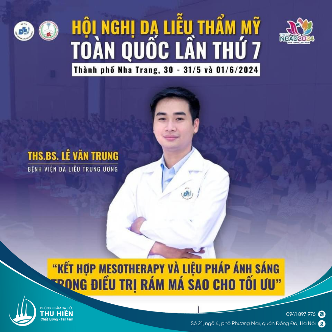 Bên cạnh đó, ThS. BSNT Lê Văn Trung, bác sĩ da liễu thẩm mỹ tại Phòng khám, đã có bài báo cáo khoa học về đề tài "Kết hợp Mesotherapy và liệu pháp ánh sáng trong điều trị rám má sao cho tối ưu". Bài báo cáo đã nhận được sự đánh giá cao của các chuyên gia tham dự bởi tính khoa học và hiệu quả thực tế mà phương pháp điều trị này mang lại.