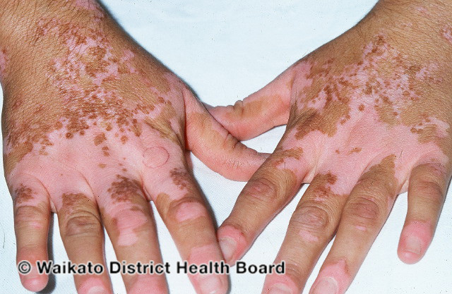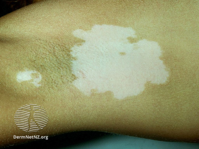 - Xác định mức độ bệnh: Xác định mức độ nặng của bệnh bạch biến bằng chỉ số VASI. Đây là chỉ số xác định mức độ bệnh bạch biến dựa theo hai tiêu chí là diện tích tổn thương và độ nặng tổn thương. Diện tích tổn thương dùng phương pháp bàntay (1 lòng bàn tay bệnh nhân bằng 1% diện tích cơ thể của chính họ) còn độ nặng dựa vào tỉ lệ phần trăm mất sắc tố tại vùng tổn thương. VASI là tổng diện tích tổn thương nhân với phần trăm mất sắc tố.