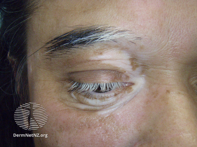 Tổn thương có đặcđiểm khu trú một bên cơ thể, không đối xứng. Vị trí thường dọc theo các dải dây thần kinh ngoại vi như cạnh mắt trên, cạnh mũi, cạnh miệng, một bên cổ, cằm vàở các vị trí này diện tích thường không lớn. Dọc theo cánh tay một bên, dọc theo mạng sườn một bên và ở các vị trí này diện tích thường lớn. Tuổi khởi phát bệnh thường sớm trước 10 tuổi. Đặc điểm nổi bật là trong tổn thương lông, tóc đều trắng. Tiến triển tổn thương thường chậm và có tính chất cố thủ với các phương pháp điều trị bằng thuốc. Thể này thường áp dụng phương pháp ghép da cho hiệu quả tốt.