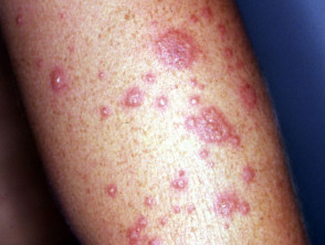 - Thương tổn cơ bản đa dạng: các thương tổn có thể là dát, sẩn, mụn nước, bọng nước và hình ảnh lâm sàng điển hình là thương tổn “hình bia bắn” hay “hình huy hiệu”, “hình con ngươi”. Đó là những sẩn phù gồm 3 vòng tròn đồng tâm: trung tâm hoại tử sẫm màu huặc là bọng nước; ở giữa là một vòng sẩn phù nhạt màu, đôi khi có những mụn nước tập trung thành vòng ở trên sẩn phù; ngoài cùng là một vòng ban đỏ.