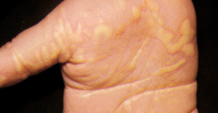 Là những nốt màu đỏ-vàng, không đau, chắc. Vị trí: bệnh thường xuất hiện ở những vùng chịu áp lực, ví dụ như gối, khuỷu tay, mông, mặt duỗi các ngón. U vàng thể củ liên quan với tăng cholesterol và tăng LDL máu.