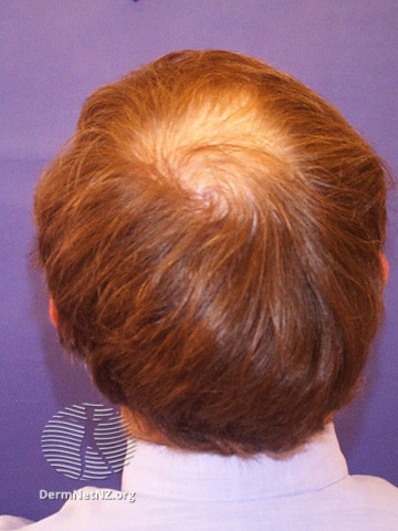 - Rụng tóc androgenetic (Alopecia androgenetic) là một hình thức phổ biến của rụng tóc ở cả nam giới và nữ giới, có yếu tố di truyền liên quan đến nội tiết tố nam testosterol. Ở nam giới, theo thời gian, chân tóc rút đi để tạo thành một hình dạng hói đầu đặc trưng "M" vùng trán. Tóc cũng mỏng gần đỉnh đầu, thường tiến triển đến hói đầu một phần hoặc toàn bộ. Ở phụ nữ, tóc trở nên mỏng trên đầu và chân tóc không rút lại như ở nam giới, hiếm khi dẫn đến hói đầu.