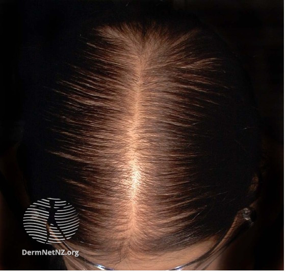 - Ở nữ giới khác biệt hơn, sợi tóc mỏng mảnh hơn, rụng thưa toàn bộ đầu. hiếm khi rụng toàn bộ như nam giới.