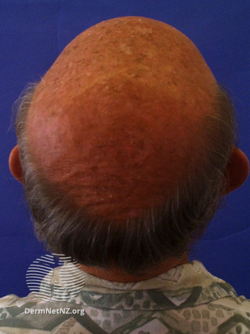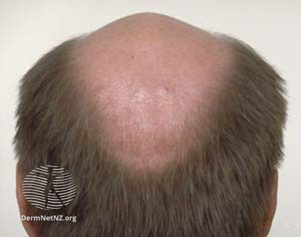 - Ở nam giới, rụng tóc Androgenetic alopecia bắt đầu từ việc giảm thiểu lượng tóc ở hai bên thái dương, sau đó tóc mọc lưa thưa ở vùng trán và đỉnh đầu, tiến đến hói đầu hoàn toàn và rụng gần hết tóc chỉ còn chừa lại một ít ở vùng chẩm và vùng ven thái dương. Ở một số trường hợp, tóc có thể rụng gần như toàn bộ da đầu.