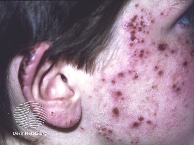 Mụn nước, bọng nước mọc trên nền da đỏ giống như chàm. Mụn nước dập vỡ đóng vảy tiết, vảy tiết bong ra để lại vết sắc tố, sẹo teo, da khô.