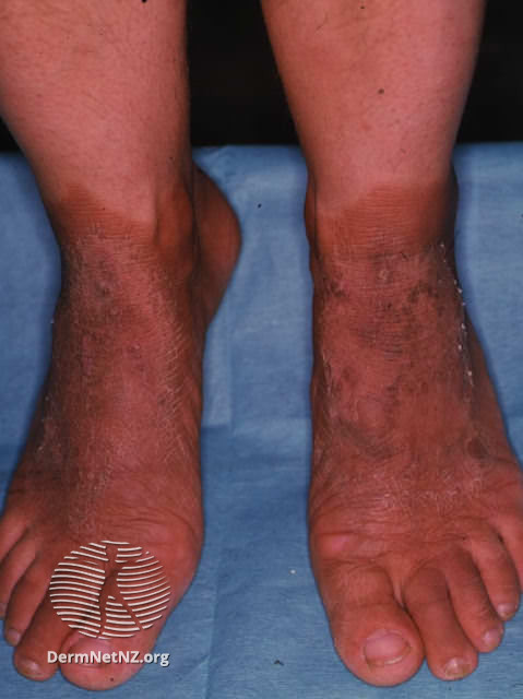 + Viêm da đậm sắc tố thành vòng: Bệnh thuộc loại phản ứng nhiễm độc ánh sáng cấp tính. Tuy nhiên biểu hiện lâm sàng lại xuất hiện đậm sắc tố từ từ theo vết (theo dòng chảy). Bệnh thường xuất hiện sau khi dùng nước hoa.Vị trí: 2 bên cổ.