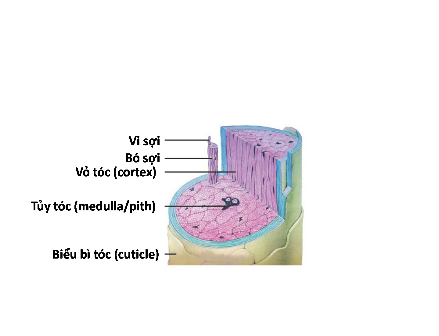 Thân tóc gồm 3 lớp: Lớp biểu bì (cuticle), lớp giữa (cortex) và lớp tủy (medulla).