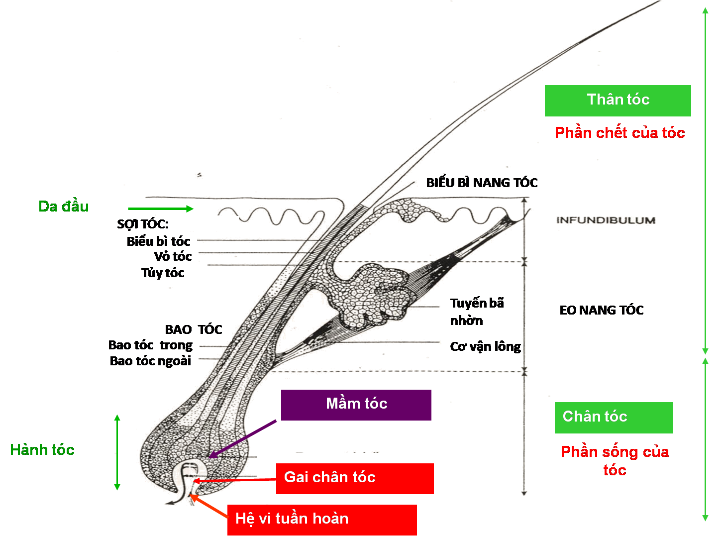 - Hành nang tóc có chứa tế bào mầm quan trọng cho việc tái tạo liên tục của nang tóc trong chu trình