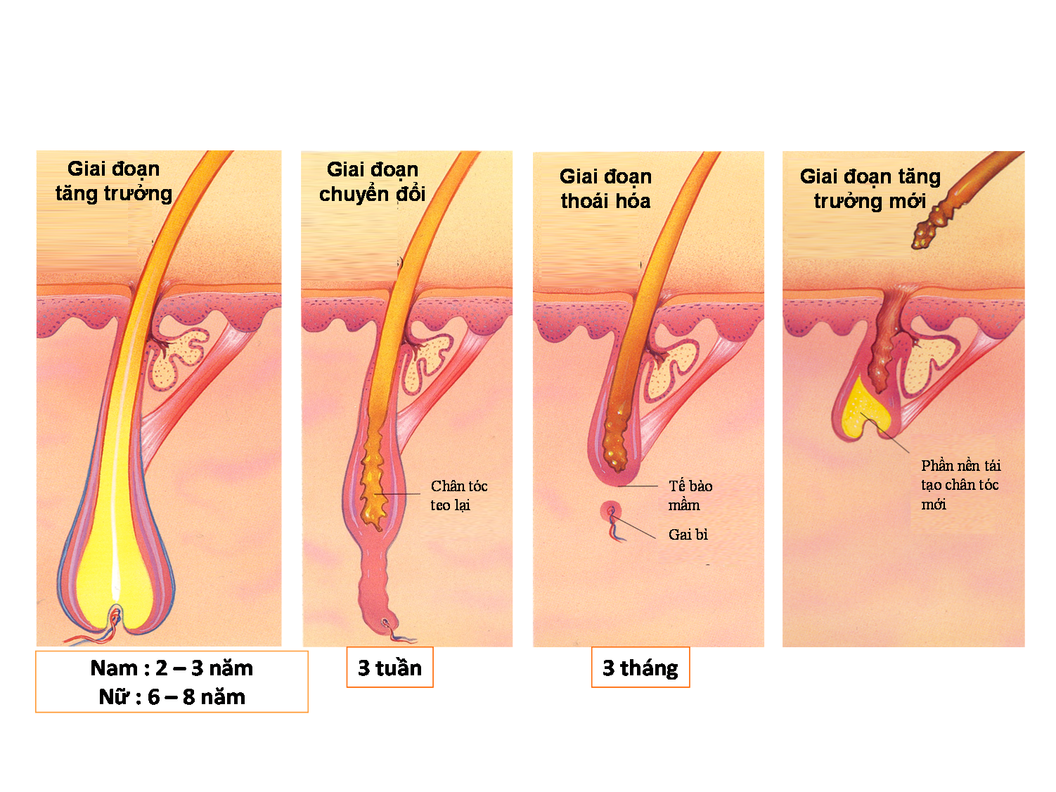 Vòng đời của tóc tuân theo 1 chu trình gồm 3 giai đoạn. Trung bình một đời người mỗi nang tóc trải qua khoảng 25 chu trình.