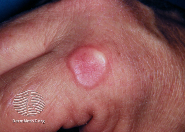 Tổn thương là sẩn, mảng sẩn (nhẵn, chắc), đường kính khoảng 1-5cm. Mảng hình tròn, nhẫn, hình cung, lõm giữa, màu da hoặc màu đỏ, màu tím.