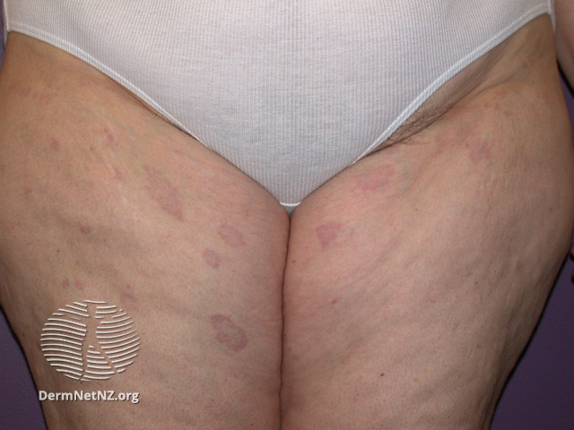 Nhiều tổn thương xuất hiện toàn thân, da màu sắc: hơi hồng, màu tím hoặc nhóm màu hoa cà, thường được sắp xếp đối xứng, đường kính từ 10cm hoặc hơn, thường xuất hiện xung quanh da nếp gấp (nách, háng).