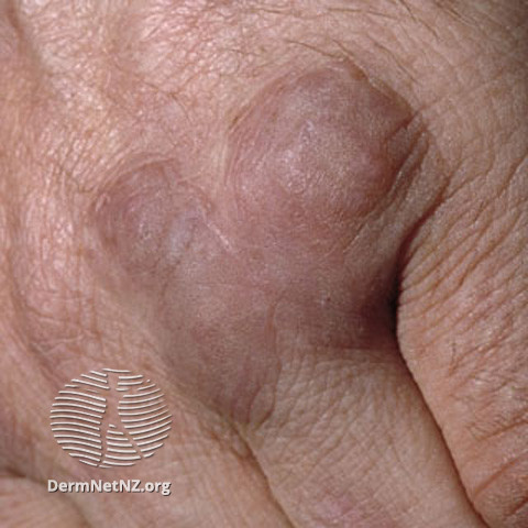 Thường xuất hiện rìa da đầu, đầu các ngón tay, vùng xương chày cẳng chân. Nốt dưới da có cảm giác đàn hồi như cao su, chúng trông giống như nốt khớp dạng thấp, nhưng phát sinh ở những người không bị viêm khớp dạng thấp.