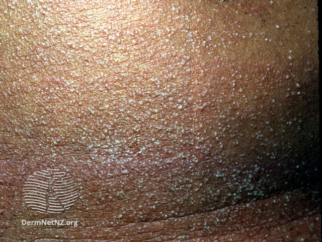 2.3. Rôm sâu (miliaria profunda): thường xảy ra khi rôm sảy đỏ bị đi bị lại nhiều lần. Thương tổn là các sẩn 1-3 mm, màu nhạt, cứng thường ở thân mình, nhưng cũng có thể gặp ở tay chân và không có ngứa hay cảm giác châm chích khó chịu như thể rôm đỏ. Rôm sâu có nguy cơ gây tổn hại vĩnh viễn tuyến mồ hôi.