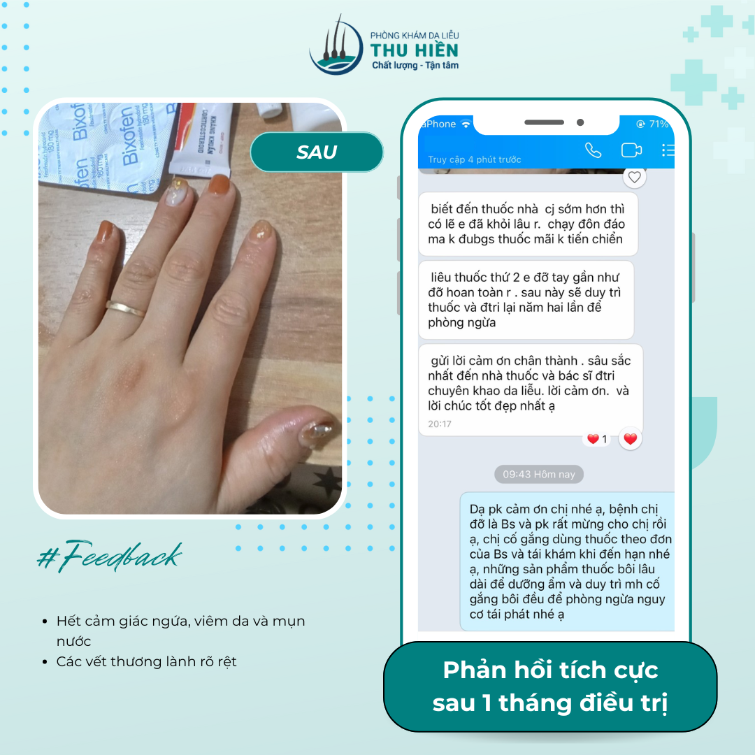 Mình cảm thấy rất may mắn khi được gặp và điều trị bệnh tại Phòng khám Da liễu Thu Hiền. Chị Hiền không những là một bác sỹ giỏi mà còn rất nhiệt tình và tận tâm với người bệnh. Đây cũng là địa chỉ tin cậy cho những ai đang gặp vấn đề về da tìm đến. Chúc chị luôn mạnh khỏe để giúp đỡ được nhiều người bệnh. Em cảm ơn chị rất nhiều.