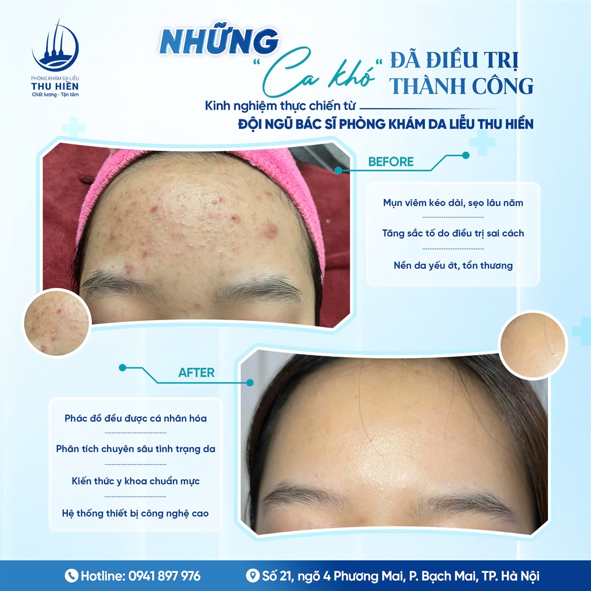 → Đây là nơi đã tiếp nhận và cải thiện rõ rệt nhiều làn da từng được xem là “bài toán khó”, từ mụn viêm nặng kéo dài, sẹo lâu năm, tăng sắc tố do điều trị sai cách đến những nền da yếu ớt, tổn thương nghiêm trọng.